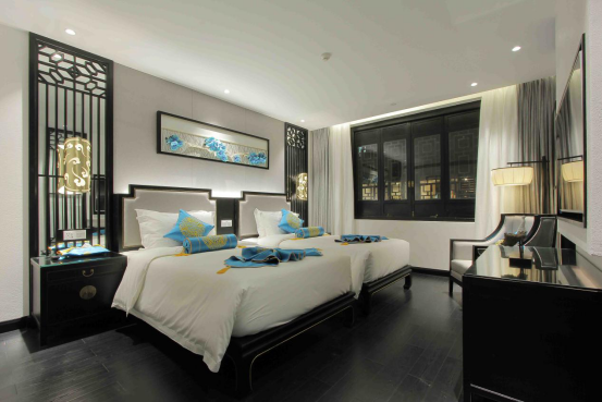 作为新中式旅居文化的传承者,云里将大气古朴的中式传统元素作为主基调用心镶嵌在触目可及之处,酒店主色调使用中国古典美学色彩中低调朴素的墨黑与轻盈简洁的乳白,灯光的精妙运用让大厅左侧整面墙体的层叠写意山水顿显恢弘。辅之暗沉厚重的金铜点缀不仅带来视觉的跳跃感也让酒店空间充满设计感。